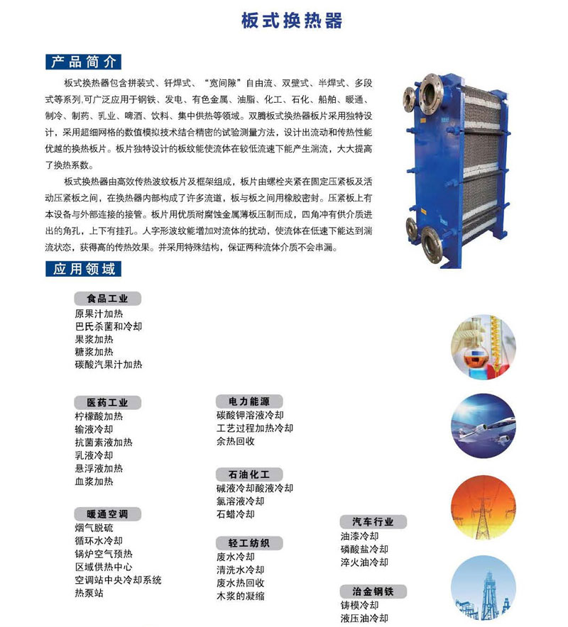 板式換熱器包含拼裝式、軒焊式、“寬間腺”自由流、雙壁式、半焊式、多段式等系列,可廣泛應(yīng)用于鋼鐵、發(fā)電、有色金屬、油脂、化工、石化、船舶、暖通制冷、制藥、乳業(yè)、啤酒、飲料、集中供熱等領(lǐng)域。