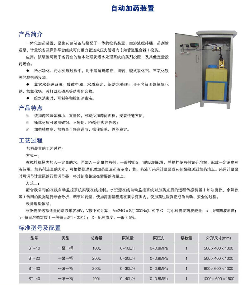 一體化加藥裝置是集藥劑制備與投配于一體的投藥裝置,由溶液攪拌桶、藥劑輸送泵計(jì)量設(shè)備及操作平臺(tái)組成,可向重力管道或壓力管道內(nèi)(如管道混合器)投藥。